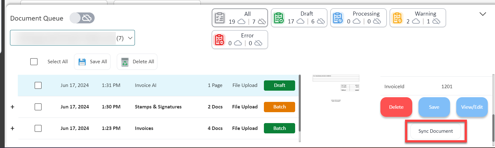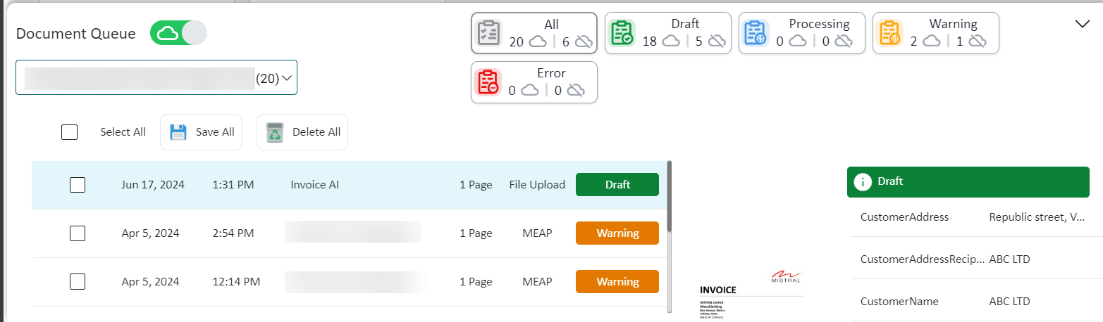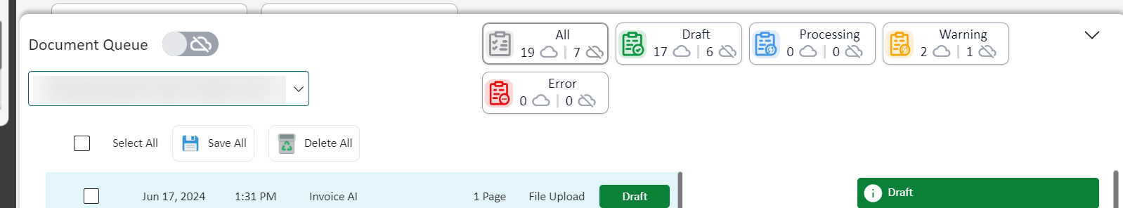 The same cloud icons for the offline and online queue are also present for the document statuses (All, Draft, Processing, Warning, Error). This is for users to be able to view how many documents they have in their online and offline queue with ease.