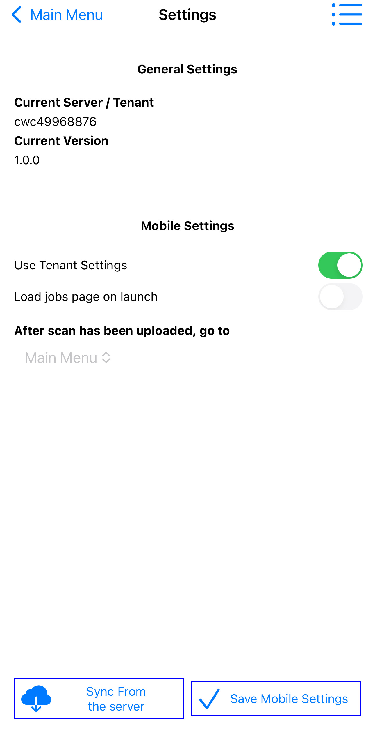 •Use Tenant Settings - Users the Mobile Settings that have been set by the administrator in the Tenant Settings tab on Scan2x Online. For more information about this, please see the Tenant Settings tab.
