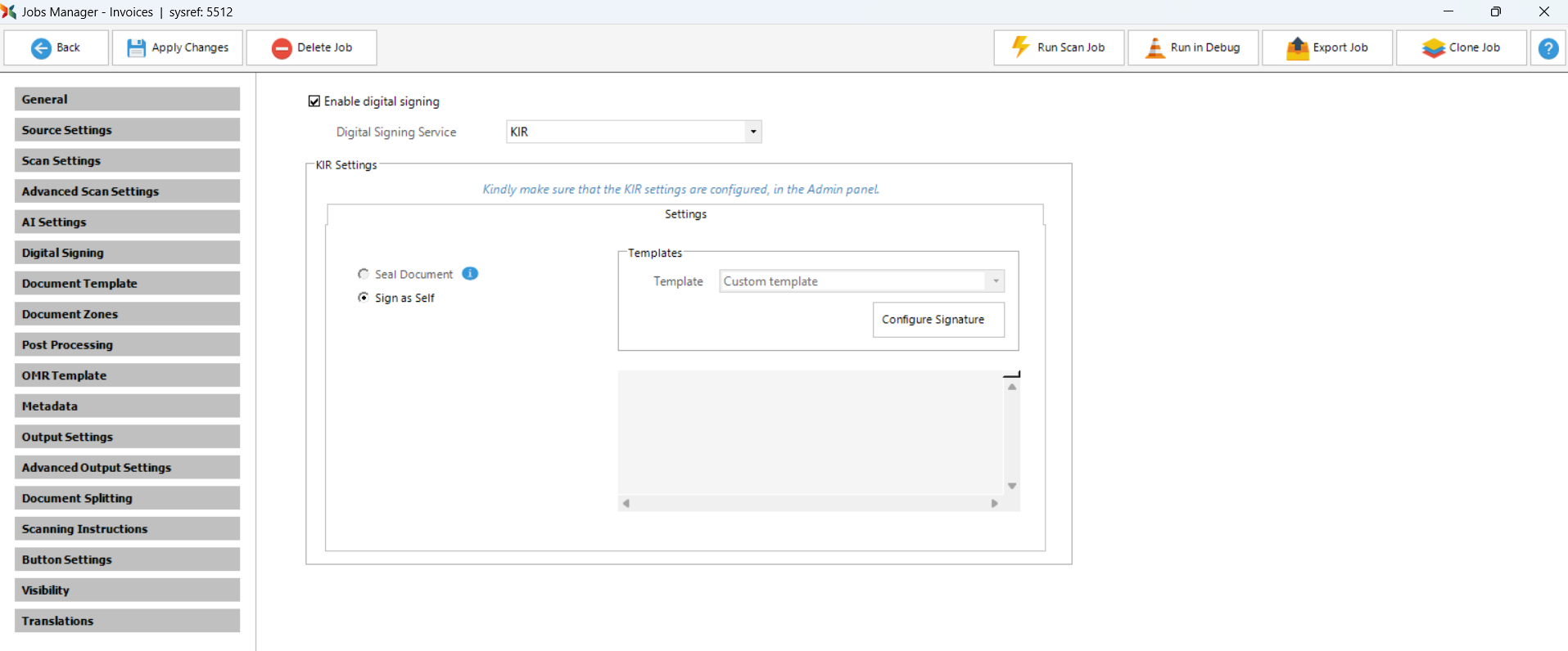 For this option to work, the KIR ceritificates must be installed (please see the KIR Setup tab) and the settings must be configured from the Admin Panel in the Digital Signing tab.