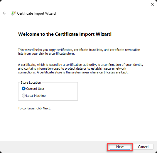 Choose whether the ceritifcate is only for the Current User logged in or whether it is for all users on the Local Machine.
