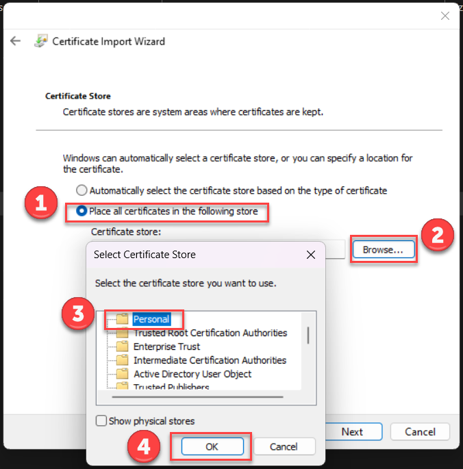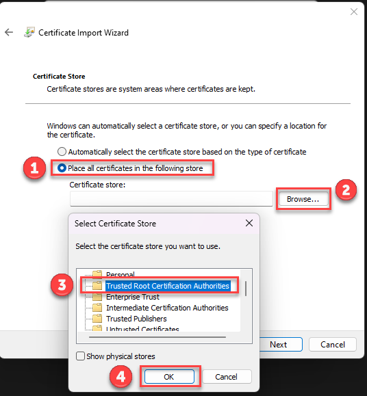 Select the option Place all certificates in the following store.