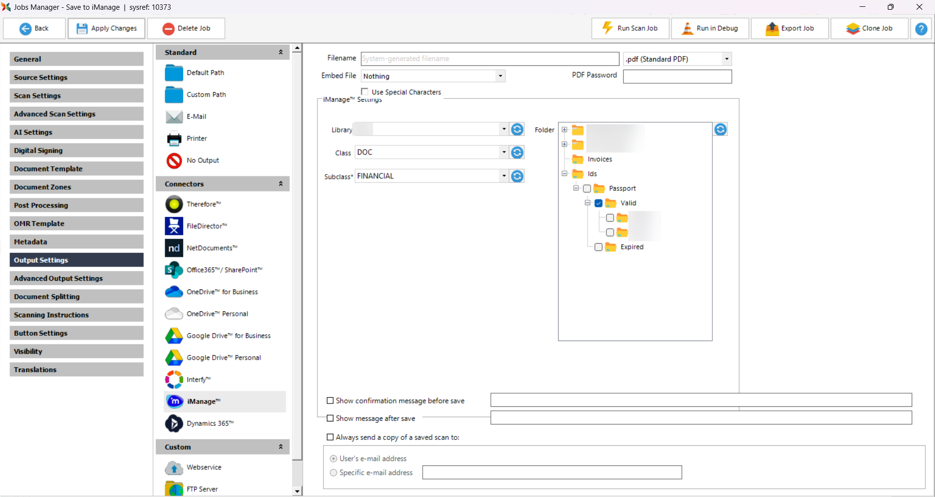 •Library - The administrator can either select a Library by clicking the blue Refresh button and selecting one from the dropdown, or the library can be set by default from the iManage™ tab from the Admin Panel