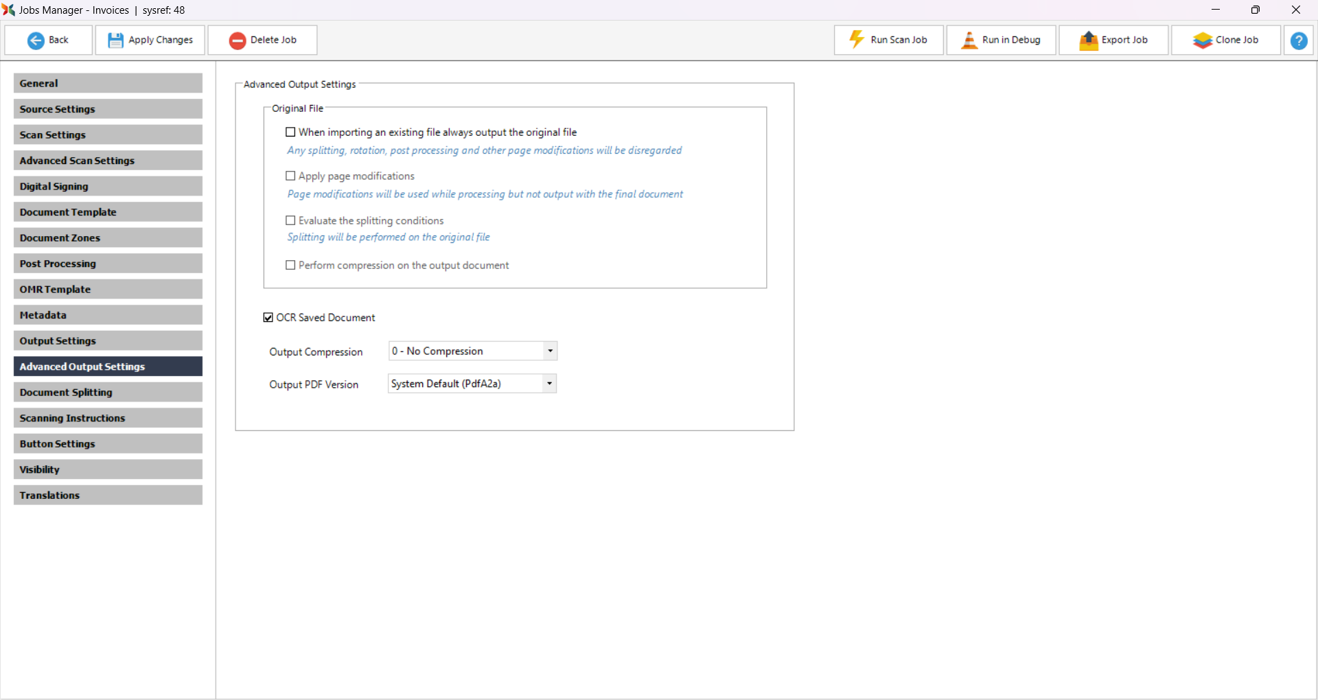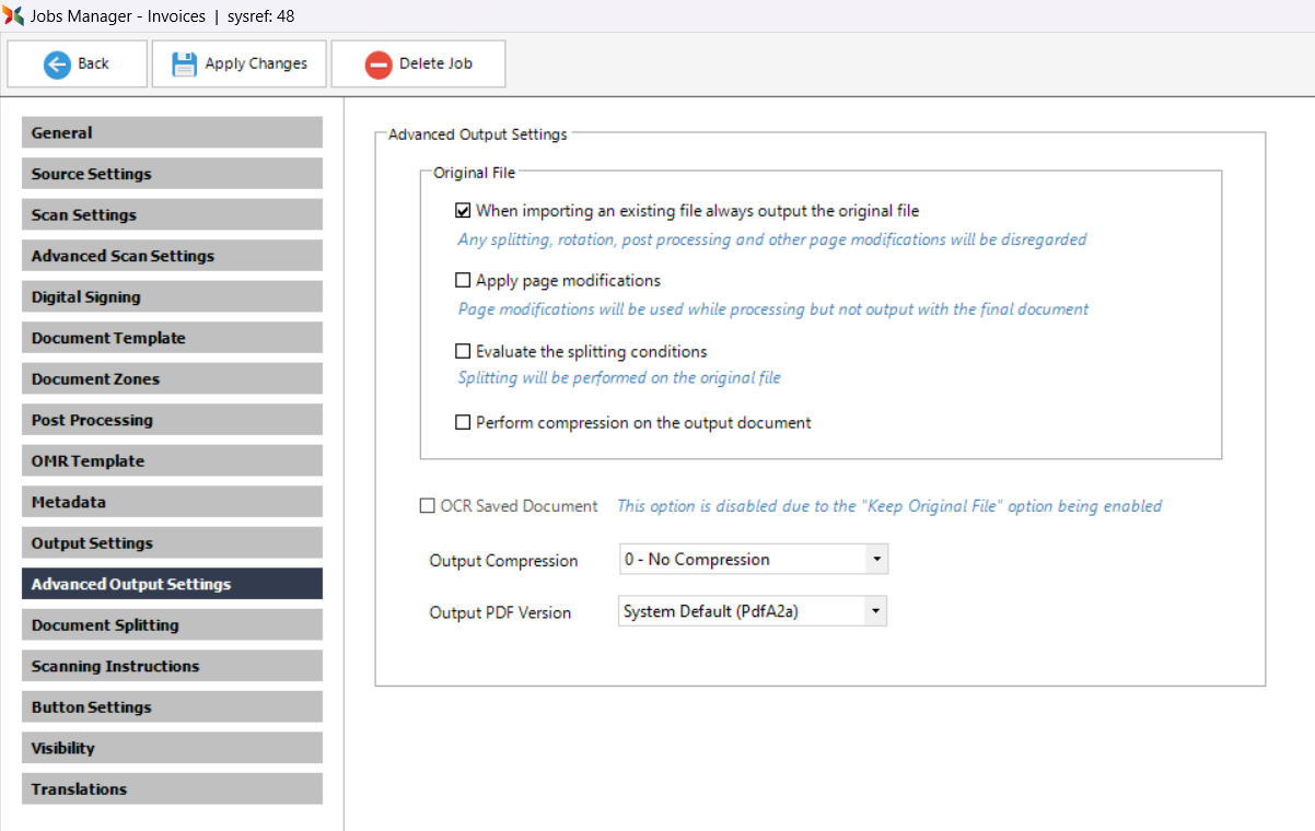 The Output PDF Version dropdown allows for the default output PDF version to be specified for each individual job.