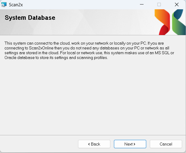 Scan2x requires the use of a database engine to maintain its records. In a network environment in which more than one Scan2x unit is envisaged, it makes sense to use a network-wide database server. This is so that all Scan2xs on the network will benefit from centralized settings and activity logging.