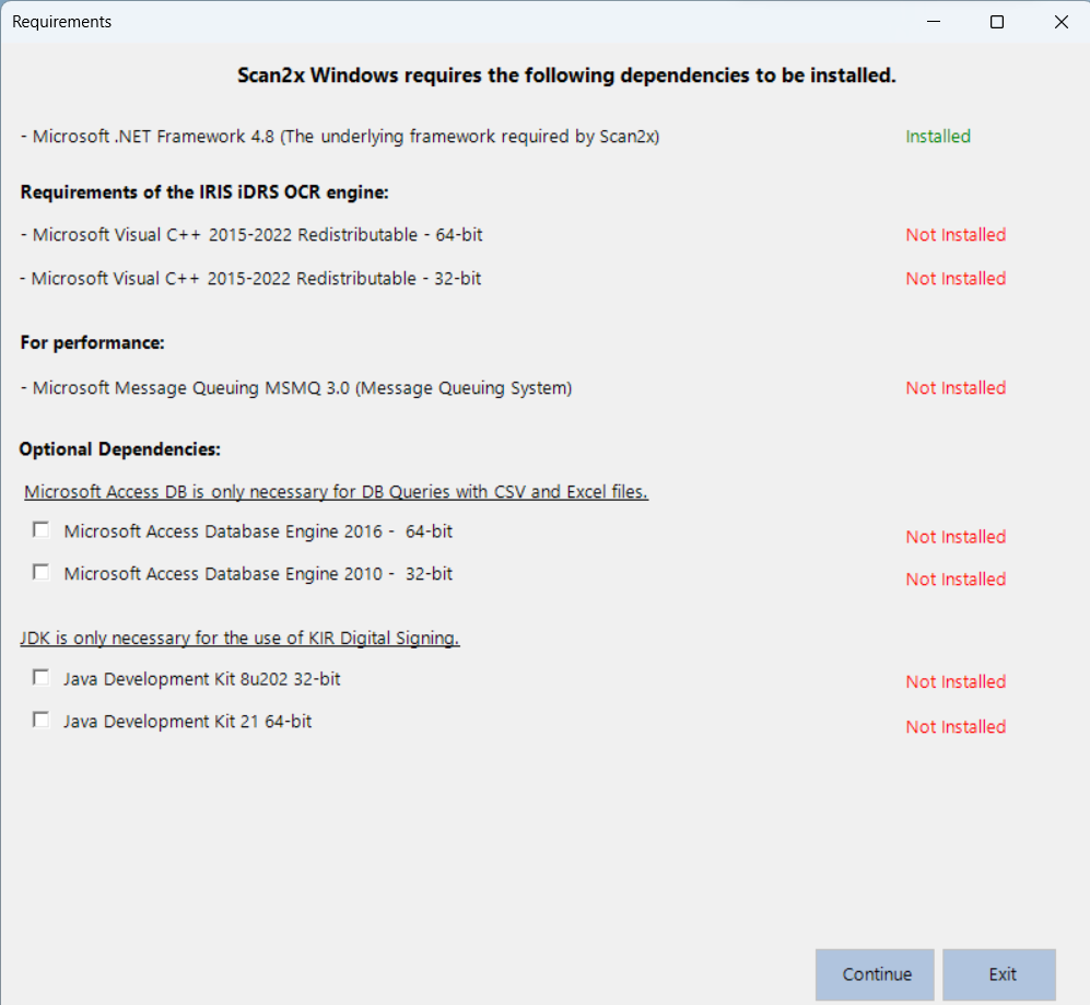 When launches the first time a pop-up with a list of requirements will appear. These requirements are optional to the user and their requirements of Scan2x. The description of each of these requirements has been explained above. The User clicks "Continue".