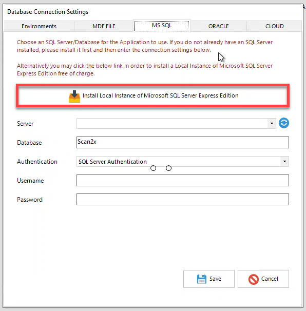 ØIf you do not have a central database server for multiple Scan2x installations, you can select to download and install a local version of Microsoft SQL Express by clicking button highlighted in the red box, as illustrated in the above screenshot. The software will begin to download SQL Server from the Microsoft site. Microsoft SQL Express is installed as a separate process before continuing with the configuration of Scan2x. For more information, please see the SQL Express & SSMS Installation tab. If you experience any troubles connecting your SQL Express and SSMS to Scan2x, please see the following FAQ.