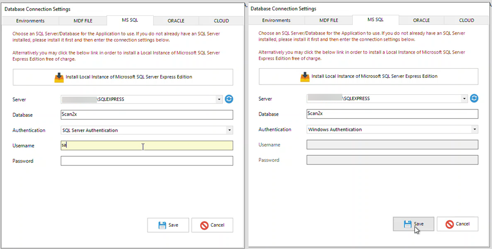 ØOnce SQL Express & SSMS have been installed, you can authenticate by using SQL Server Authentication (we recommend inputting the user 'sa') or Windows Authentication, as seen in the screenshots below. If you do not see the instance in the Server dropdown, open the SSMS application and copy the Server Name, and paste it in the Server section of Scan2x.