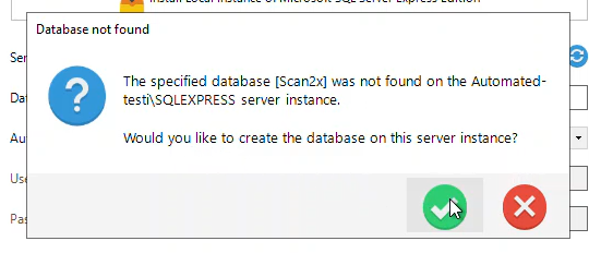ØIf Scan2x is not found in the database on the server instance, Scan2x will ask if it can create its database. Click Yes.