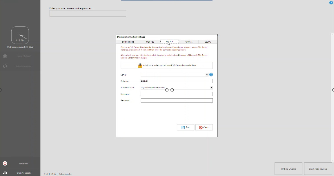 When Scan2x launches for the first time it will check for the existence of Microsoft SQL Server on the PC. If an instance is found it will prompt this in the Server dropdown. If an instance is not found, you can click the 'Install Local Instance of Microsoft SQL Server Express Edition' button to install a free version of Microsoft SQL Express. Select this local installation option if installing a trial version or a single-Scan2x system. For installations in which multiple Scan2x units on the same network are required, it is recommended that a central SQL server is used to host the Scan2x database.