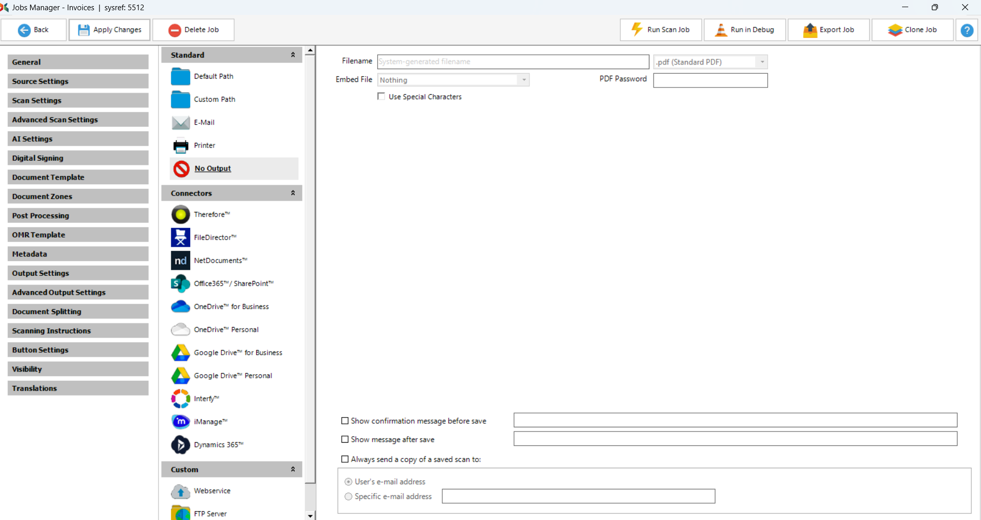 In these cases, the initial job that captures the document can be set to “No Output”.