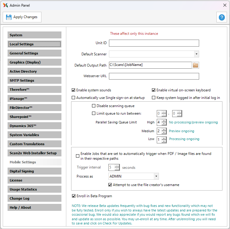 Unticking this checkbox disables the system sounds that Scan2x uses by default to indicate a user action. Examples of system sounds include “button press” sounds made when a user types in their PIN number upon login.