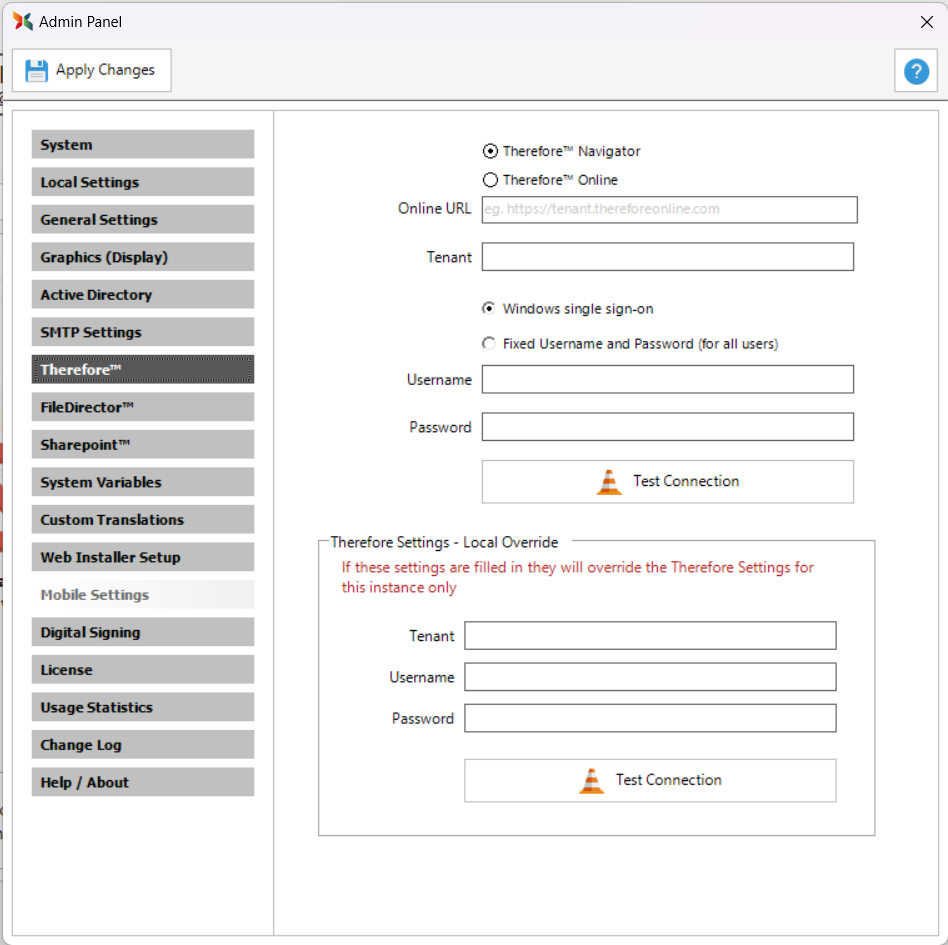 The Therefore™ Tab is used to enter the Therefore™ DMS user created especially for Scan2x to access. Scan2x uses these credentials for all aspects of its communication with Therefore™.