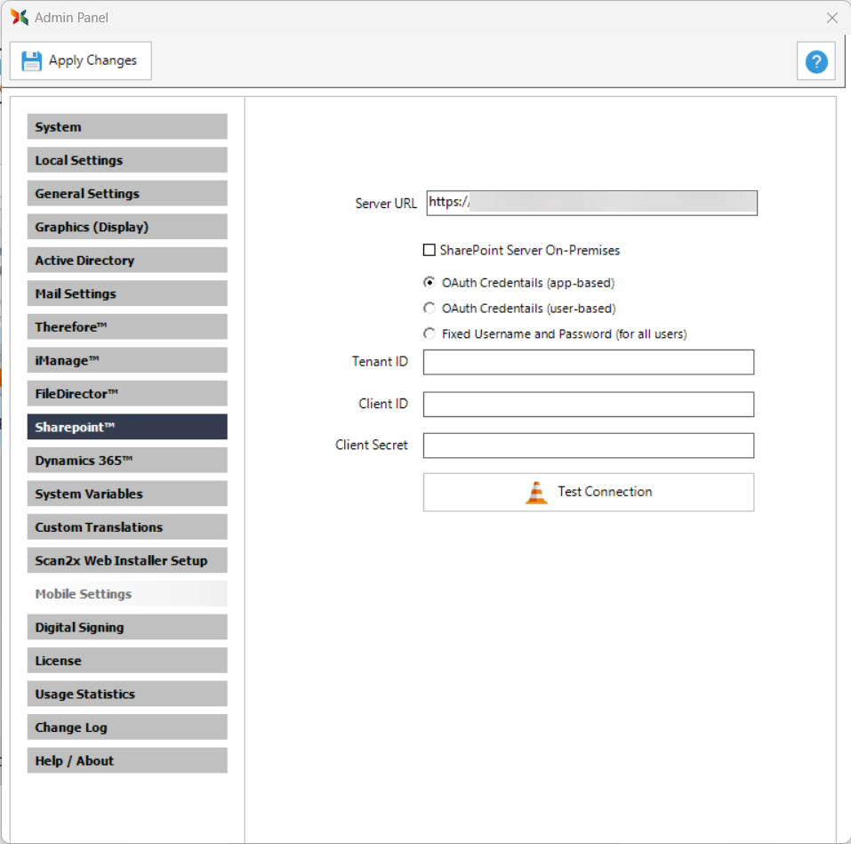 The Sharepoint™ Tab is used to enter the Sharepoint™ user created especially for Scan2x to access. Scan2x uses these credentials for all aspects of its communication with Sharepoint™. For more information, please look at the Sharepoint™ Online OAuth Intergration with Scan2x Tab.