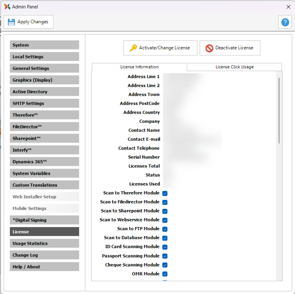 Use the “Activate/Change Licence” button when activating a new Scan2x installation or to refresh it – for example, when you have changed the options available on your licence.