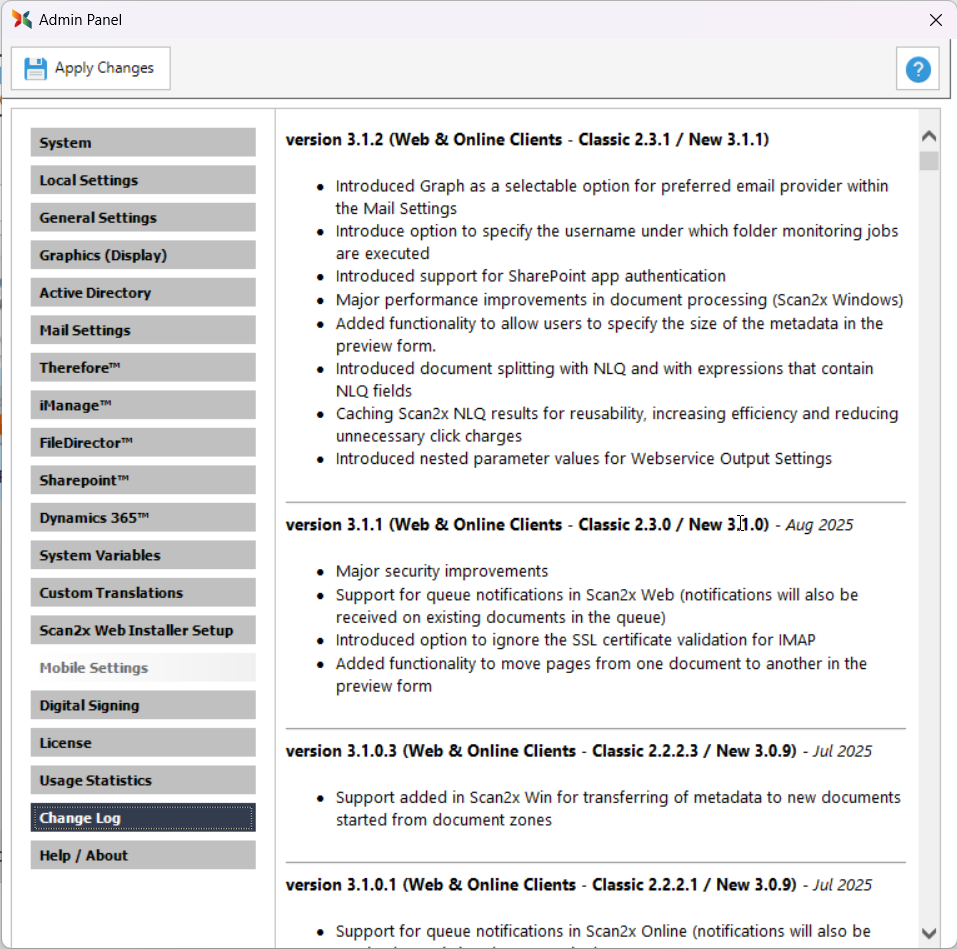 Use the Change Log Tab to view the latest updates that have taken place to Scan2x system.