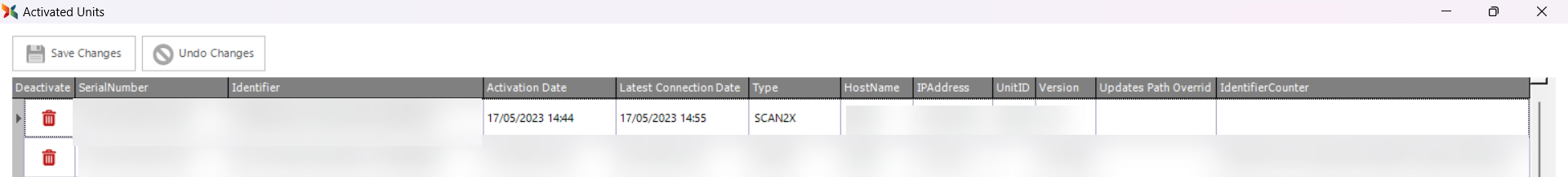 Activated Units tab provides administrators with a list of all Scan2x licences that have logged on to the network, together with their serial numbers.