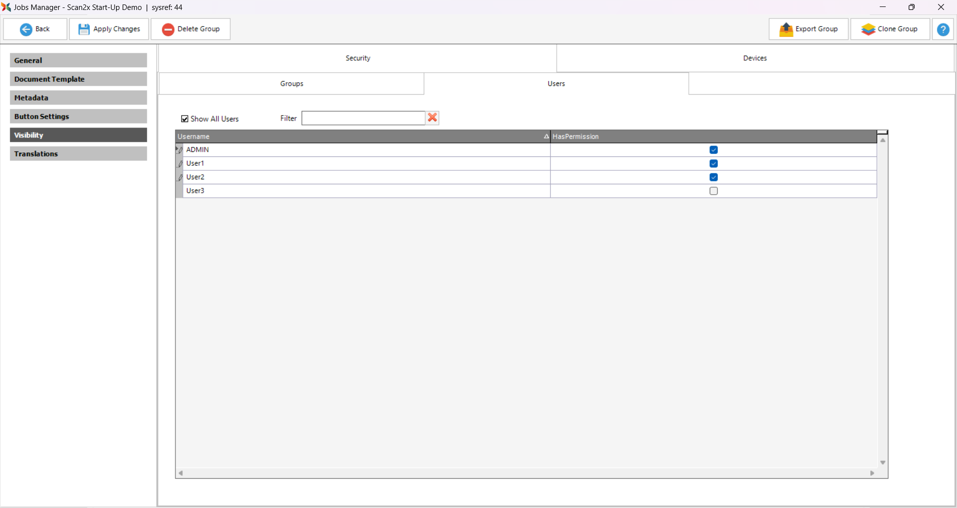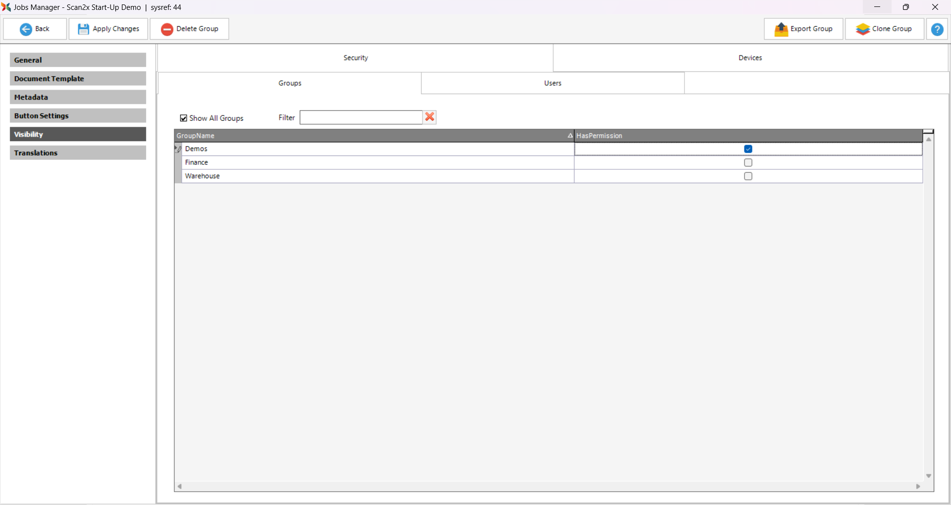 Each button configured in Scan2x can optionally be assigned a set of permissions, governing whether the button is displayed for particular users and/or on particular devices.