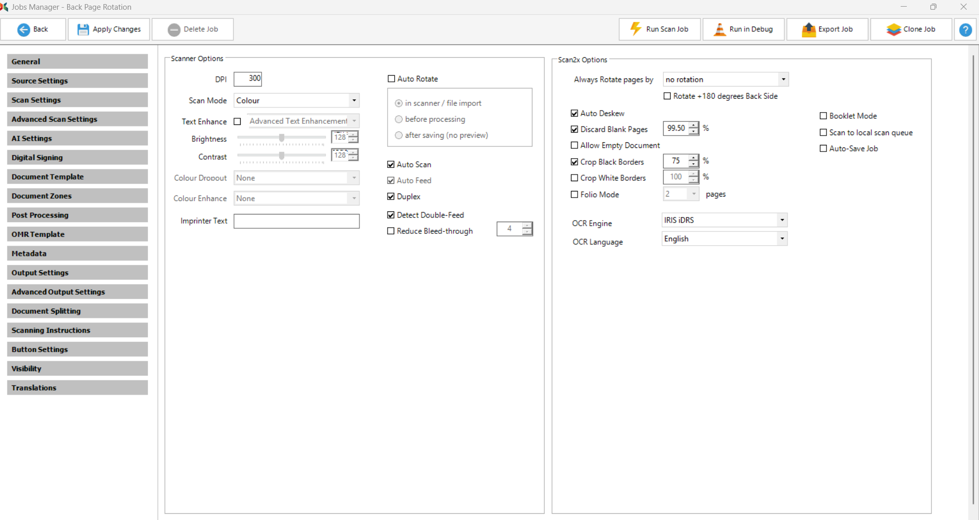 To set the scan resolution for this job, enter the DPI required into the DPI text box. Use the Scan Mode drop down to select between colour, grayscale or black and white (binary) scans. In addition, there may also be additional proprietary modes in there related to scanner models.