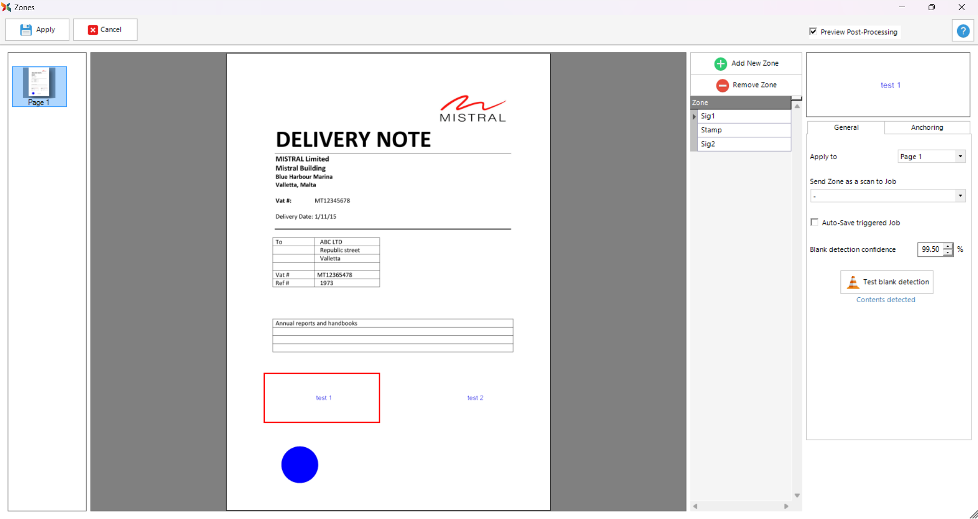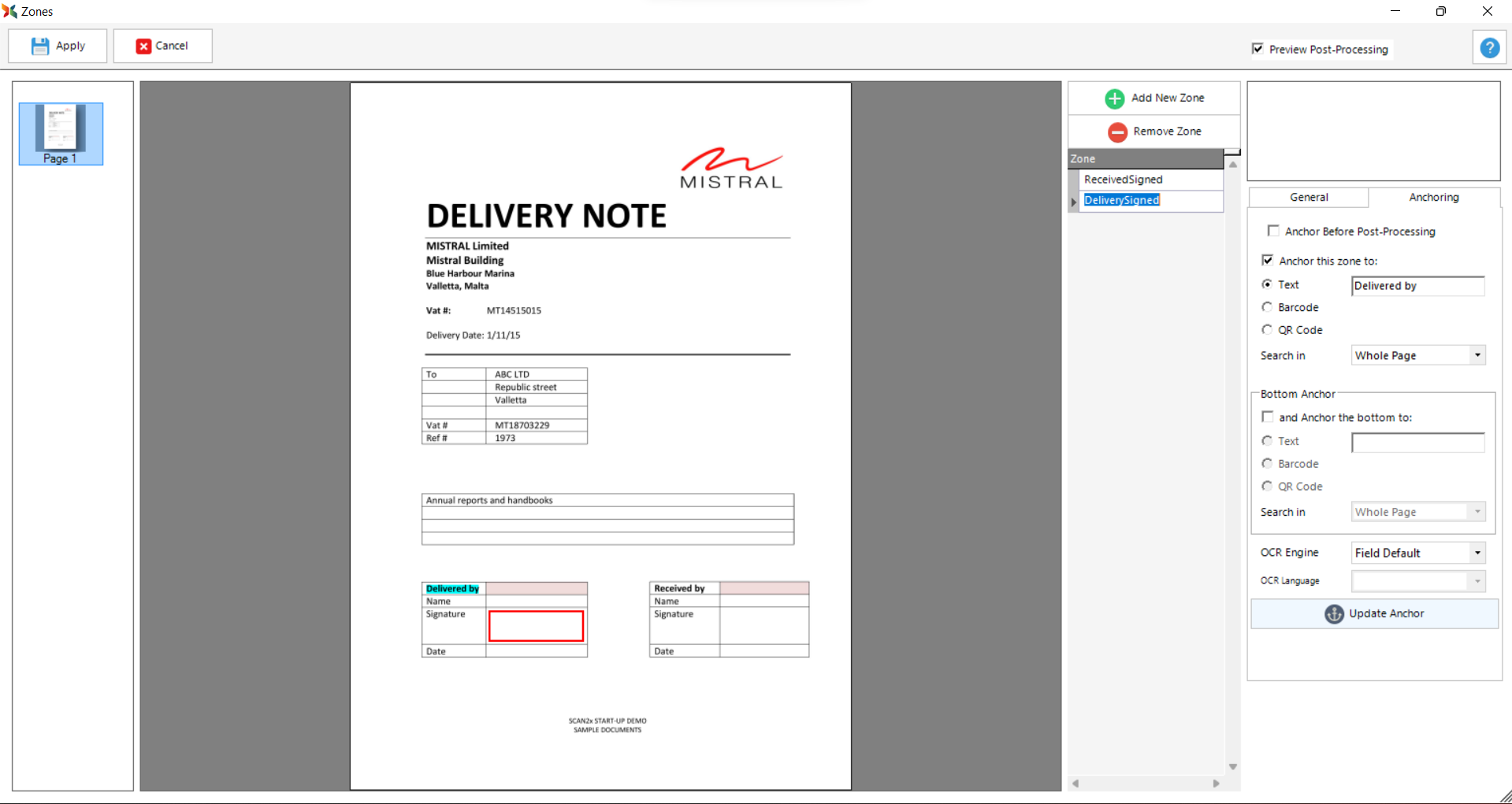 As can be seen on the right-side of the screen in the image below, under the Anchoring tab, the Anchor Before Post-Processing checkbox allows the administrator to anchor zones before any post-processing changes are applied to the document. For example, if there is a post-processing option applied where the whole document page only shows the colour 'blue', then the administrator would need to tick this checkbox so the zone will be anchored accordingly. If this checkbox is not ticked, the zone will not manage to find its anchor. For more information about post-processing, please see the Post-Processing Tab.