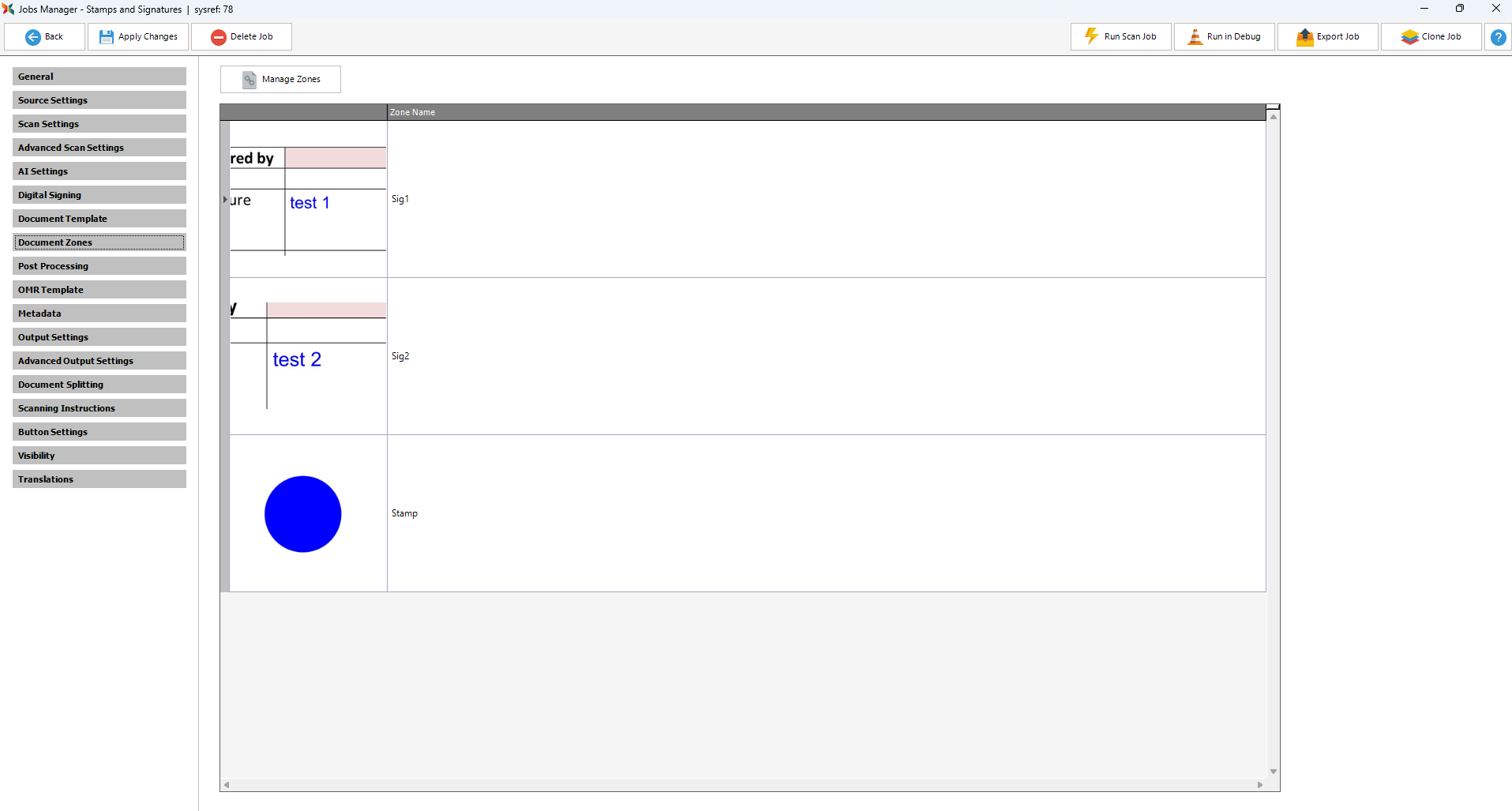 If a zone is defined on a document in which a rubber stamp, signature or some other essential mark is required for a document to be considered as ‘valid’ or acceptable to enter the scanning process, then it is possible for Scan2x to test at point of scanning whether that zone actually has a mark in it. It is NOT possible to verify the authenticity of that signature or mark – only that a mark exists. In other words, that the defined zone is not empty. This can be very useful when scanning documents such as delivery orders, invoices, bank cheques, contracts, etc, in which signatures or other similar marks are expected to be in specific locations.