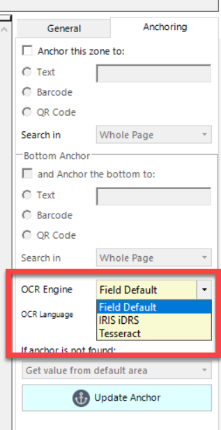 The Anchoring function can be found on the far right of the Manage OCR Zones screen for Metadata.