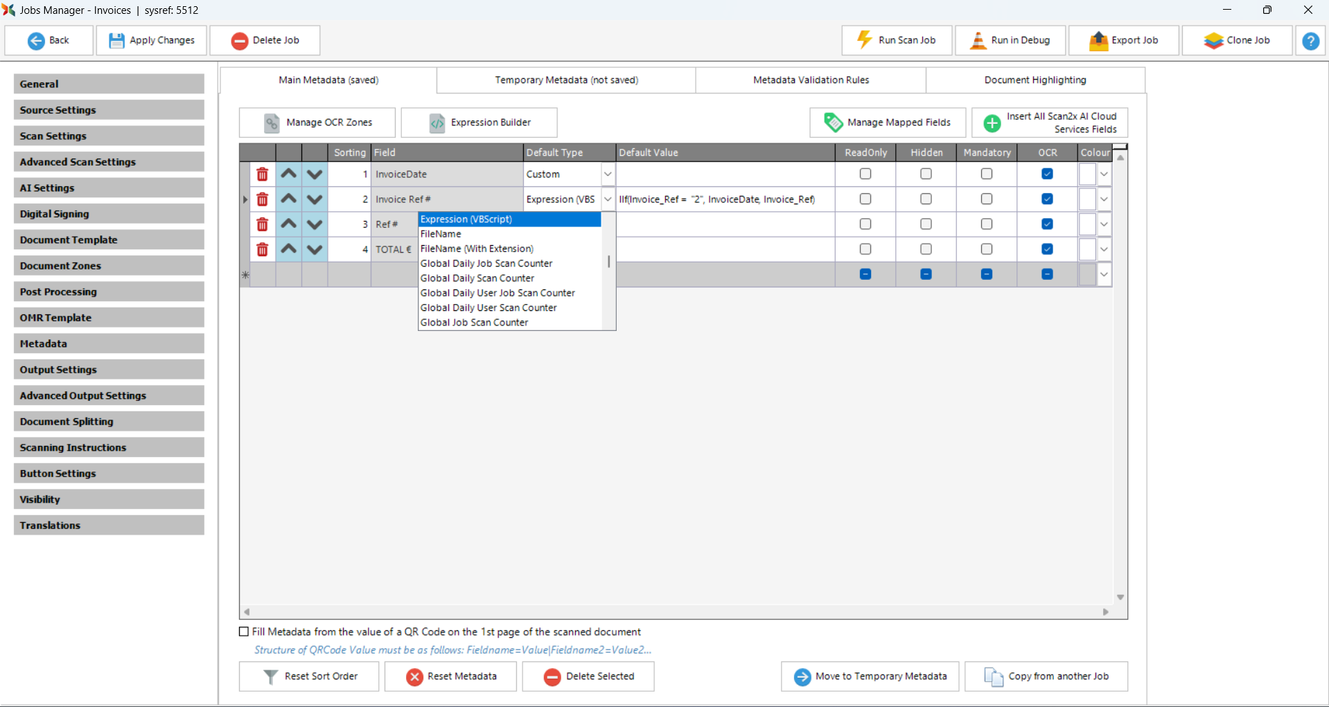 By defining a metadata field as Expression (VBScript), you can use a subset of the VBScript scripting language to determine the ultimate value of the field. The expression can either be manually entered, or for those who are not totally conversant with VBScript, an Expression Builder is provided to help with syntax.