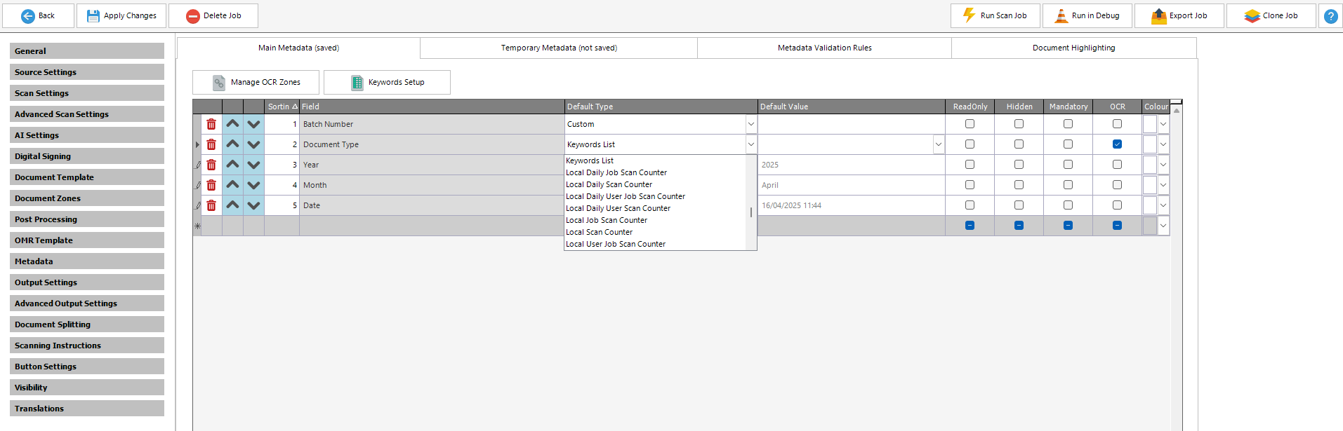 It is also possible to set a metadata field as a Keyword List – this is a pre-defined list of values from which the user must choose at scan time.