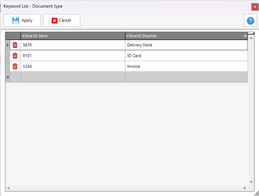 As an example of a Keyword List, consider the screenshot above. A list of four keywords have been defined. In this example, users at scan time will choose between four options as defined in the right-hand column Value to Display, whereas what will be saved to the document metadata is listed in the Value to Save column at left.