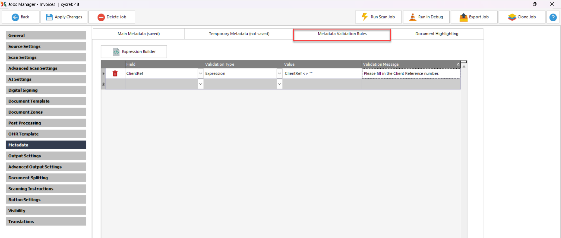 It is possible to define one or more Validation Rules to control what is entered to describe a document.