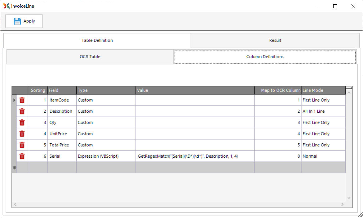 When you click the Define Table button, a grid appears like the one in the screenshot below. The shot below shows the table definition for the Delivery Notes job included with the Scan2x demo.