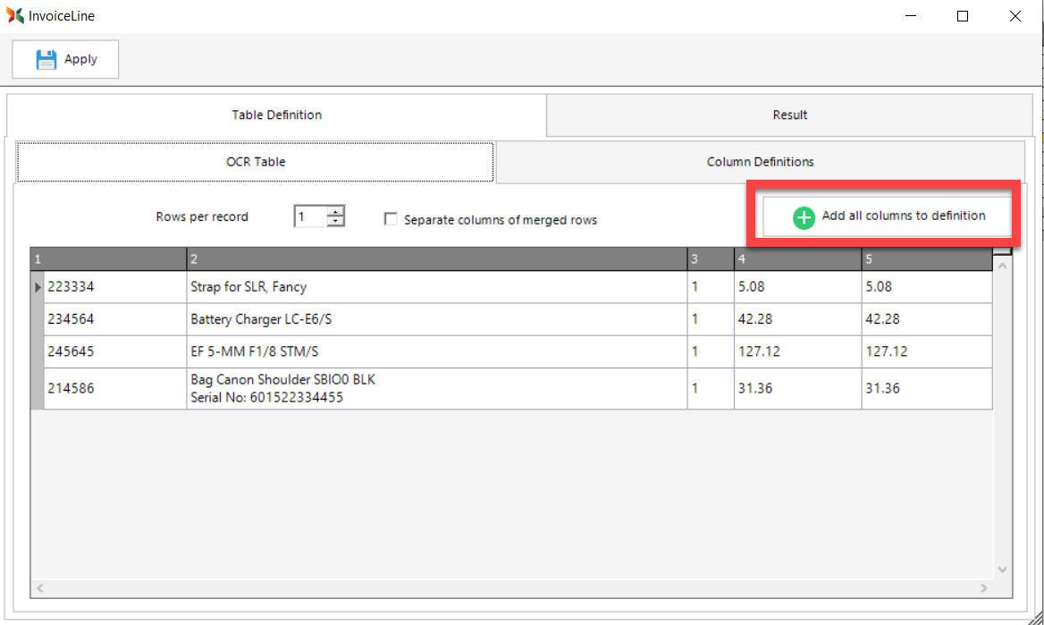 •Clicking on the Add all columns to definitions button as shown in the first screenshot below. Since there are 5 columns in the grid below, once this button is clicked, 5 column fields will automatically be added to the Column Definitions tab.