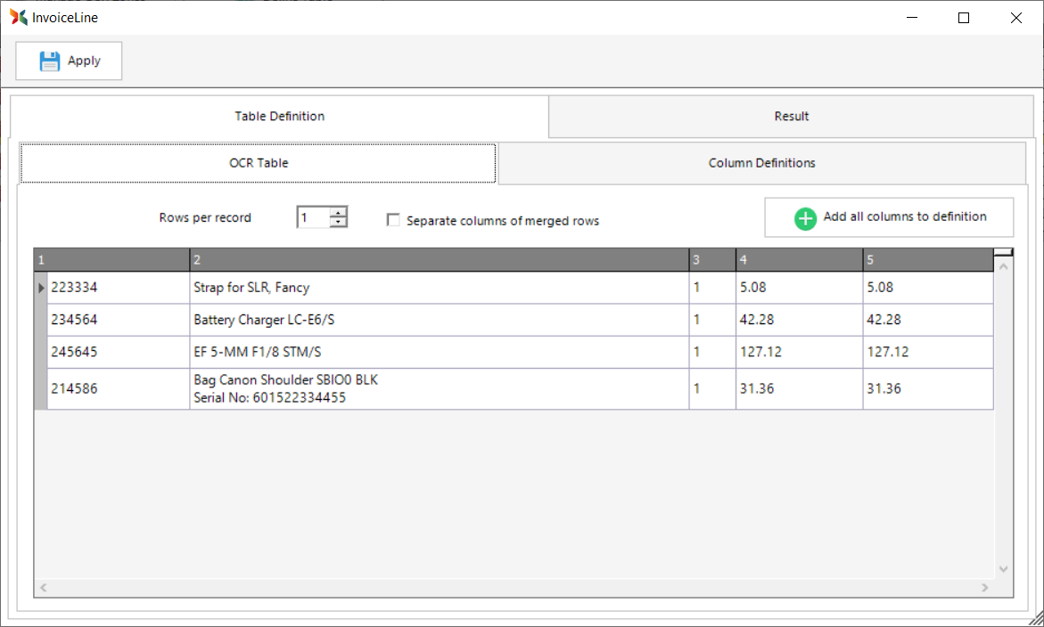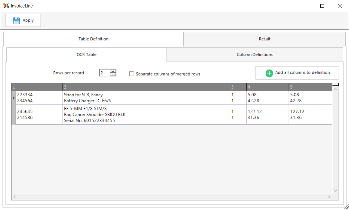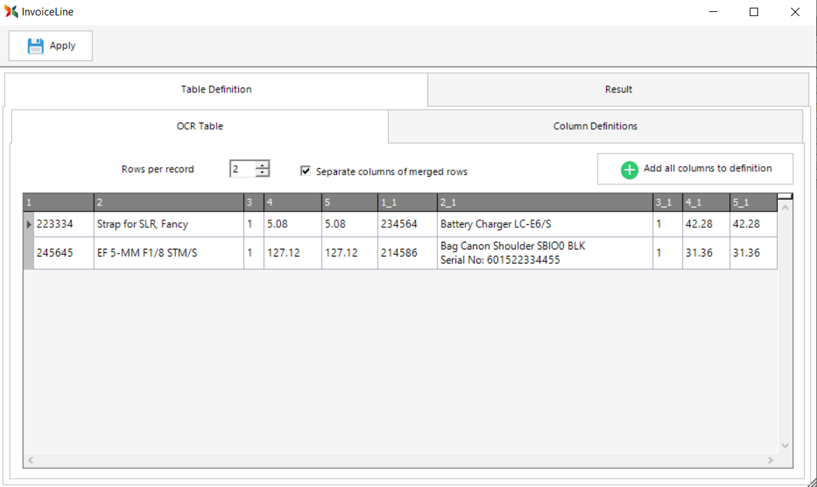 To ensure consistent column headers, Scan2x will allow you to define your own column names and you can then map the columns off the invoice to your own columns.