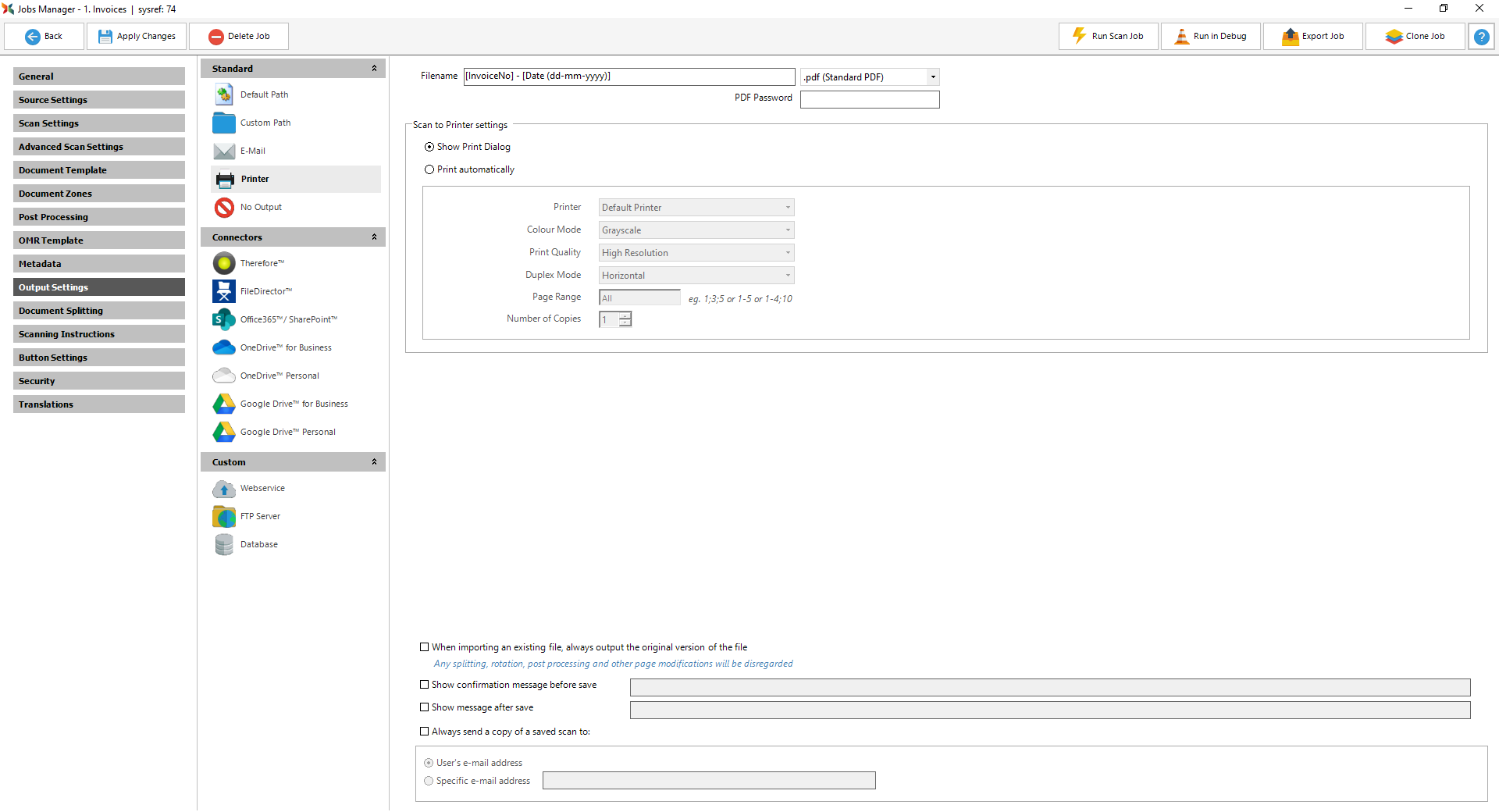 The Scan to Printer option allows Scan2x to be used as a photocopier, with the advantage that any scanner connected to Scan2x can be used (including large format scanners) and that any printer can be used as the output device.