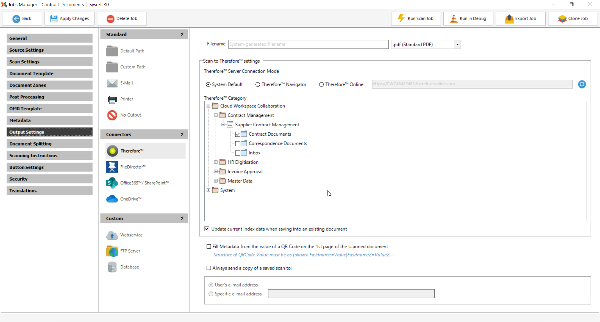 A job that is configured to output documents to Therefore™ will automatically pull all metadata settings from Therefore™ once a Document Category has been selected by the person setting up the job.
