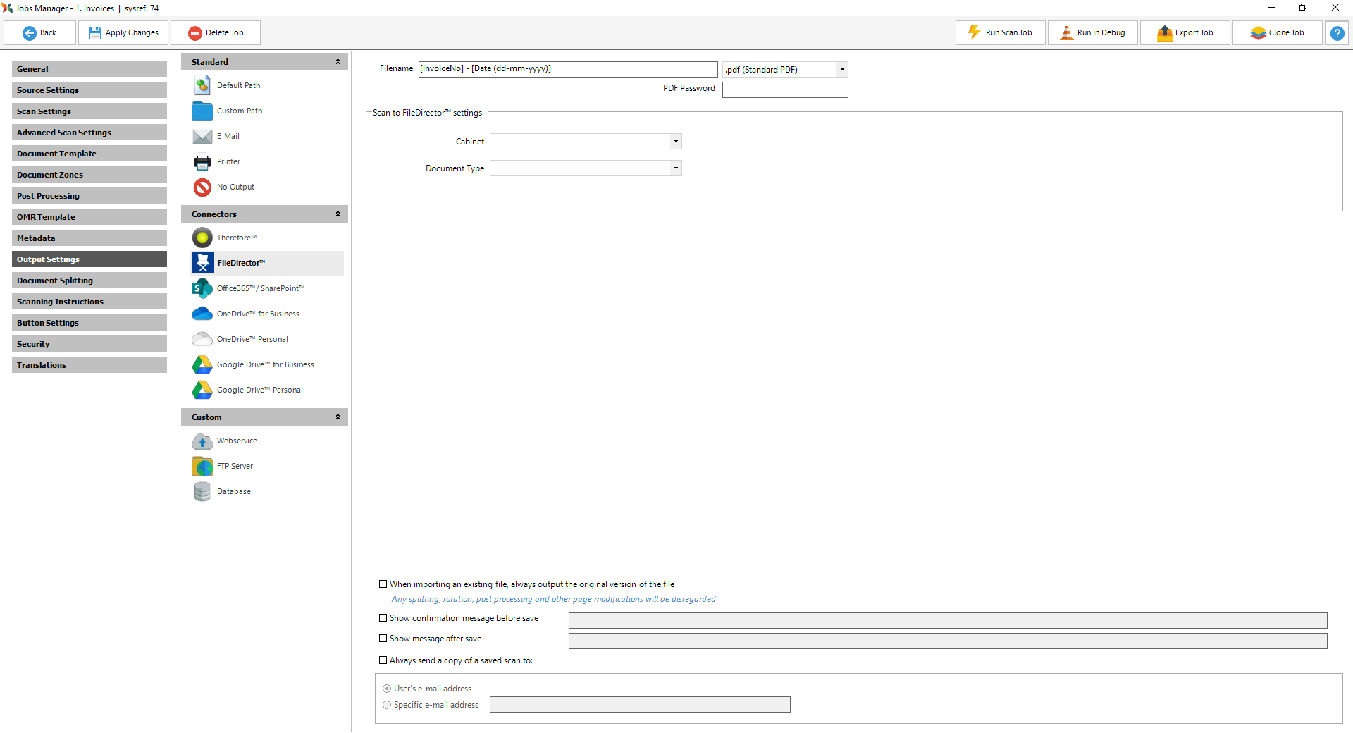 The connection to FileDirector™ is set up in the Admin panel. For further information, please refer to the FileDirector™ Tab in the Administrator's Guide.