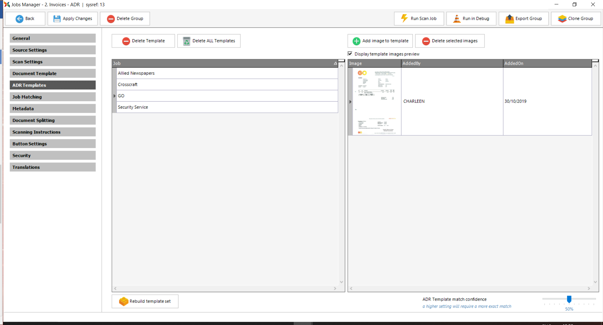 The ADR Templates added here during the creation of the ADR Group will be used initially to recognize the first batches of documents scanned. If only one Template is added for each document profile it is possible that the first scan runs will not recognize a proportion of documents scanned, and so it is possible to assign document types at scan time.