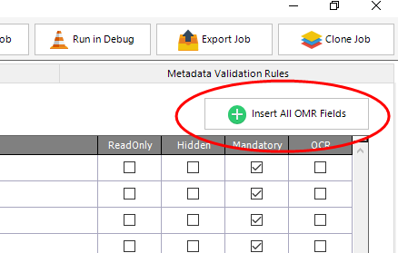 Once the OMR configuration is complete, it is necessary to add each question to the job metadata so that answers can be stored with each document. To do this, go to the Metadata Tab in the Job Configuration screen and hit the Insert all OMR Fields button.