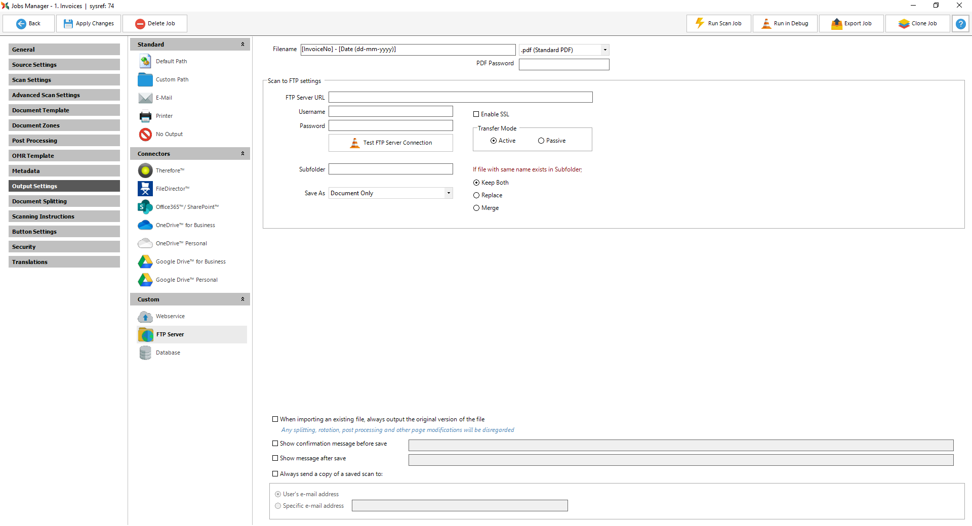 The Scan to FTP tab allows for the configuration of an FTP server as final destination for scans. This is very useful in a scenario in which communication between Scan2x installed in an outlying location and the central server is unreliable.