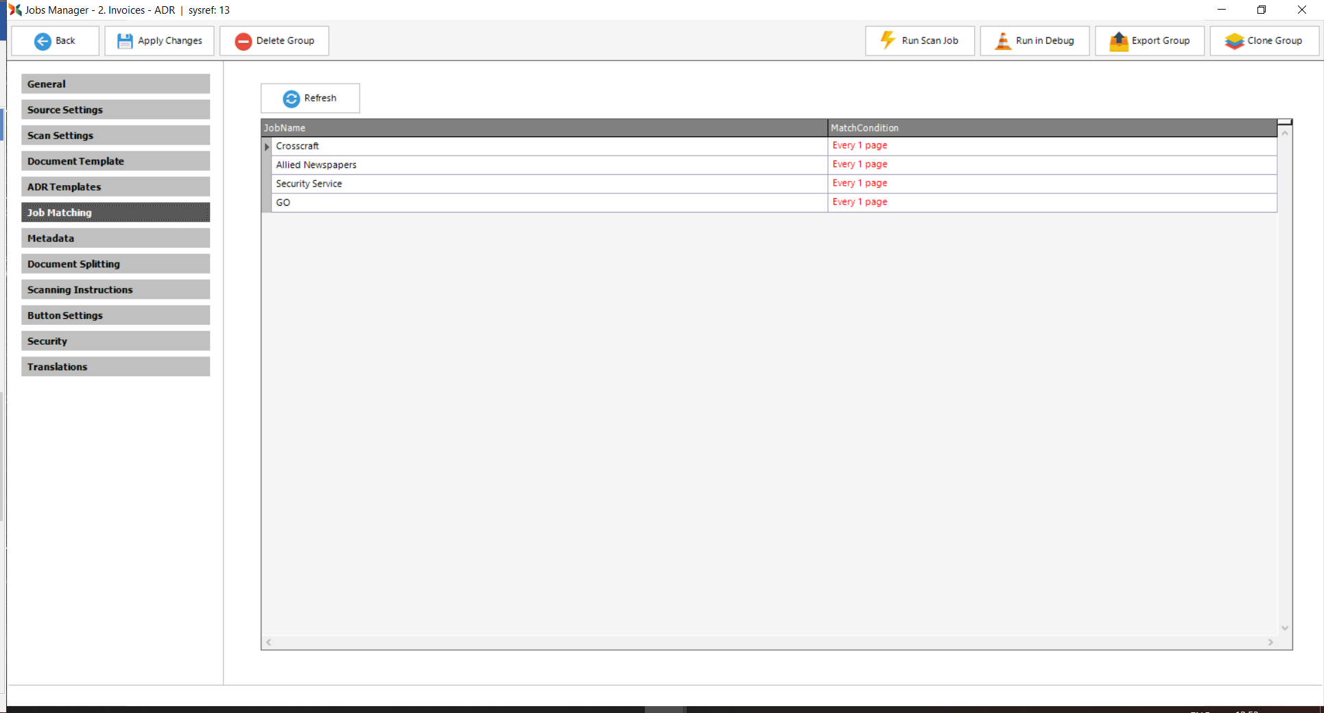 If the text under the MatchCondition column is green, this means that the rules set for the child jobs are unique to them and so the system can differentiate scanned invoices to the child jobs.