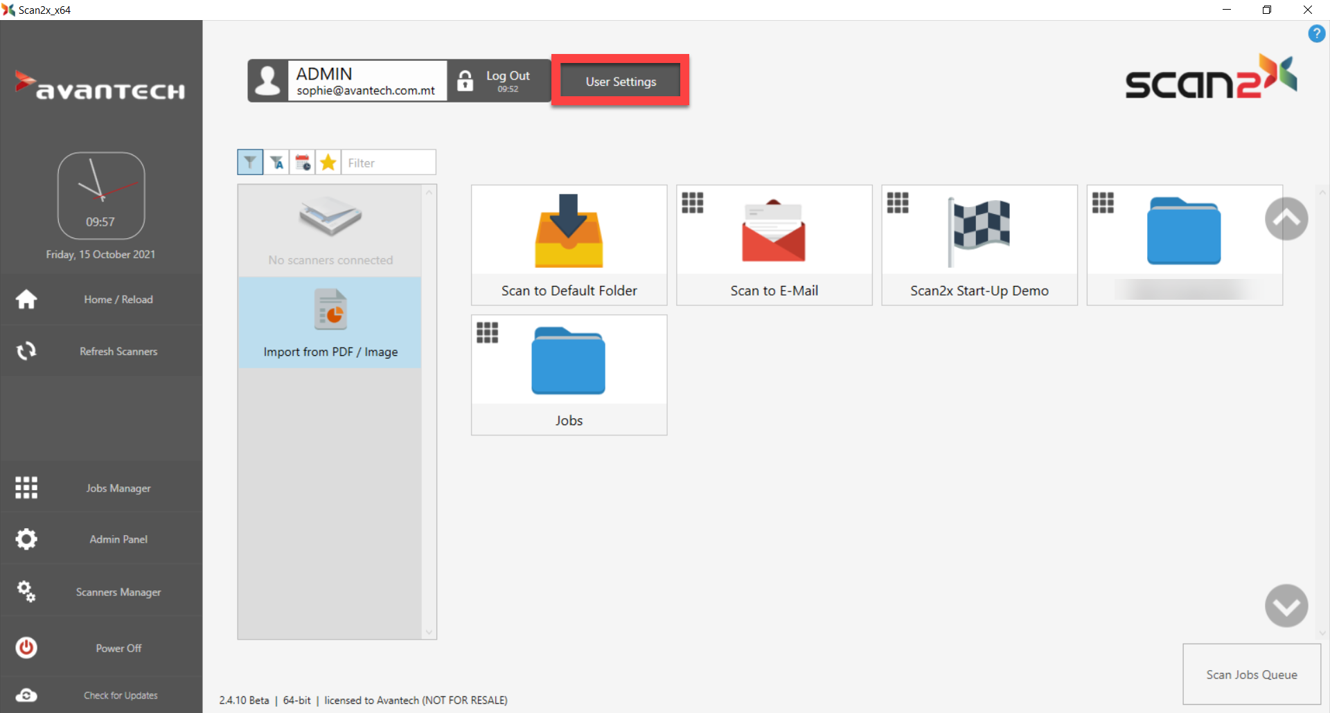 The User Settings button is accessed by clicking on this button shown on the main page of Scan2x as highlighted in the red box in the screenshot below.