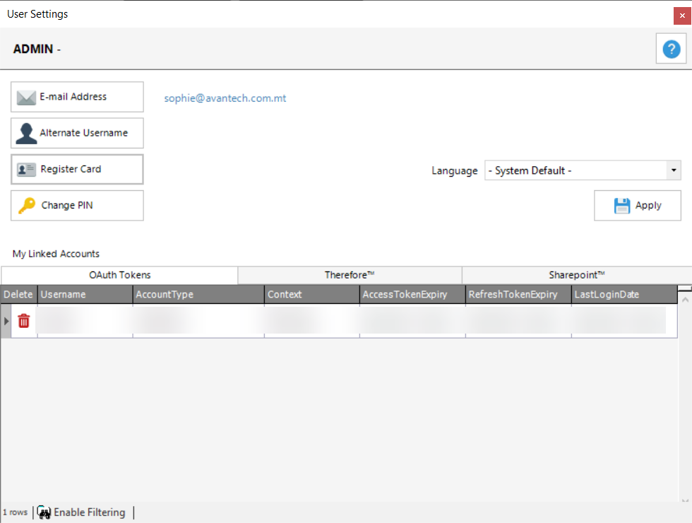 It is also for users to be able to add user-specific credentials to be used when connecting to services like Therefore™ and Sharepoint™.