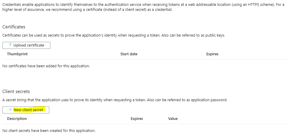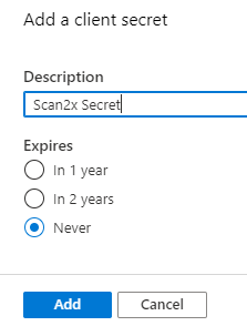 Click on ‘New Client Secret’. Call it “Scan2x Secret” and set it never to expire. Click on ‘Add’. Make sure to take a copy of the Client Secret immediately as it will be hidden after some time. Keep the Client Secret handy as it will be required in the next section.