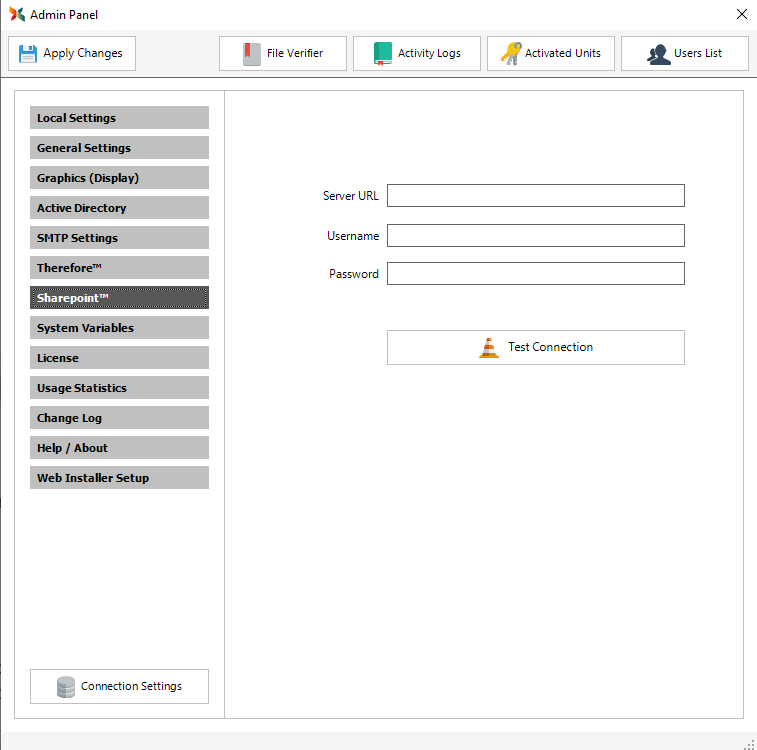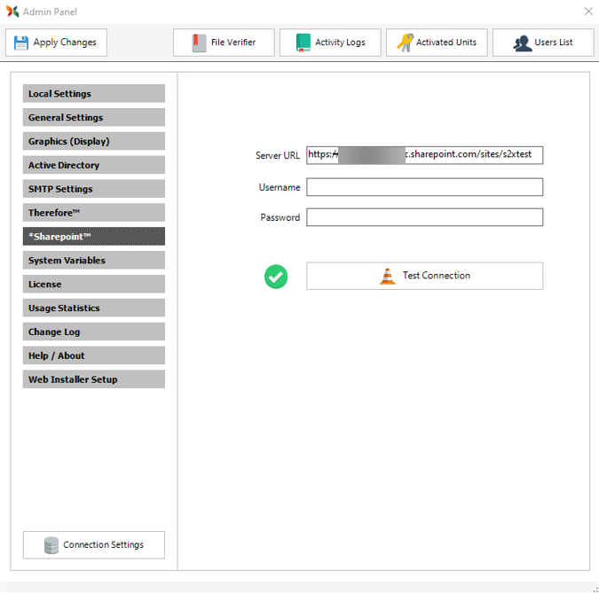 Click on Admin Panel and navigate to SharePoint (refer to ‘Admin Panel’ button shown above). In the Tenant URL insert the SharePoint site you want to connect with. Leave the Username and Password fields empty. Then click on ‘Test Connection’.