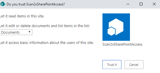When this manual is completed, SharePoint/Azure AD token information will be saved alongside the currently logged on username within the Scan2x database. This will allow this user to continuously access the SharePoint Online site without requiring to logon to Azure AD again. The token information will be valid for 6 months. Once expired, the user will simply be asked to re-authorize. This token information will only be valid for the currently logged on user. Other users that require access to SharePoint Online in the same way will need to repeat the authorization process for their user.