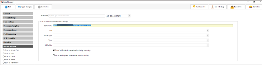 Note – ‘The Connecting from Scan2x’ section describes the setting of the SharePoint OAuth token information for the logged-on user within the Admin Panel, shown in the Sharepoint™/Office365™ Tab. This means that the token can then be re-used from any Scan2x job created. Only 1 SharePoint site can be configured at an Admin level. However, the same process described can be repeated at Scan2x Job level. Different jobs can be configured to connect to different SharePoint sites, shown in the Scan to Sharepoint™/Office365™ Tab.