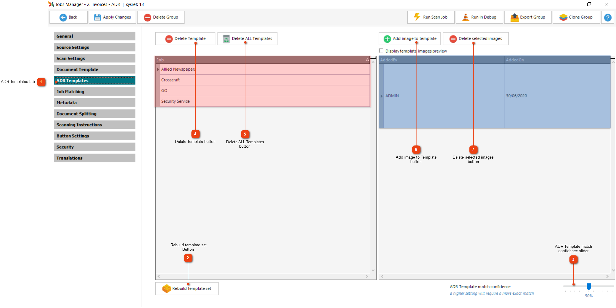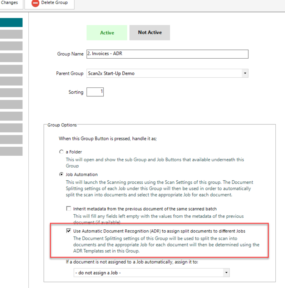 ADR Document Matching is selected by ticking the Use Automatic Document Recognition tick box on the General tab of a group within Jobs Manager.