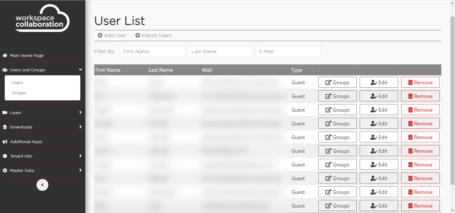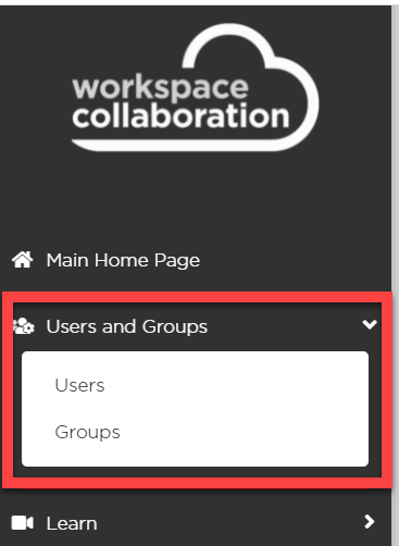 From the CWC Home page, administrators can view the users and groups from the side panel on the left-hand side of the screen.
