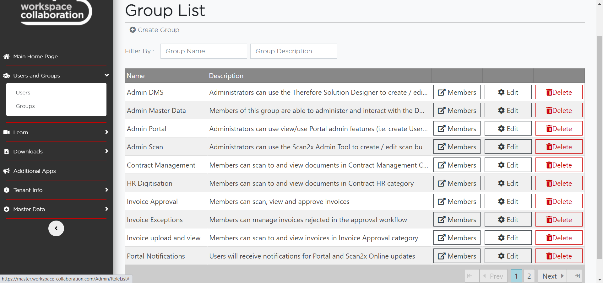 Administrators can view the users of a particular group, search for a group by using the filter option, create a group, edit (changing the name or description) and delete.