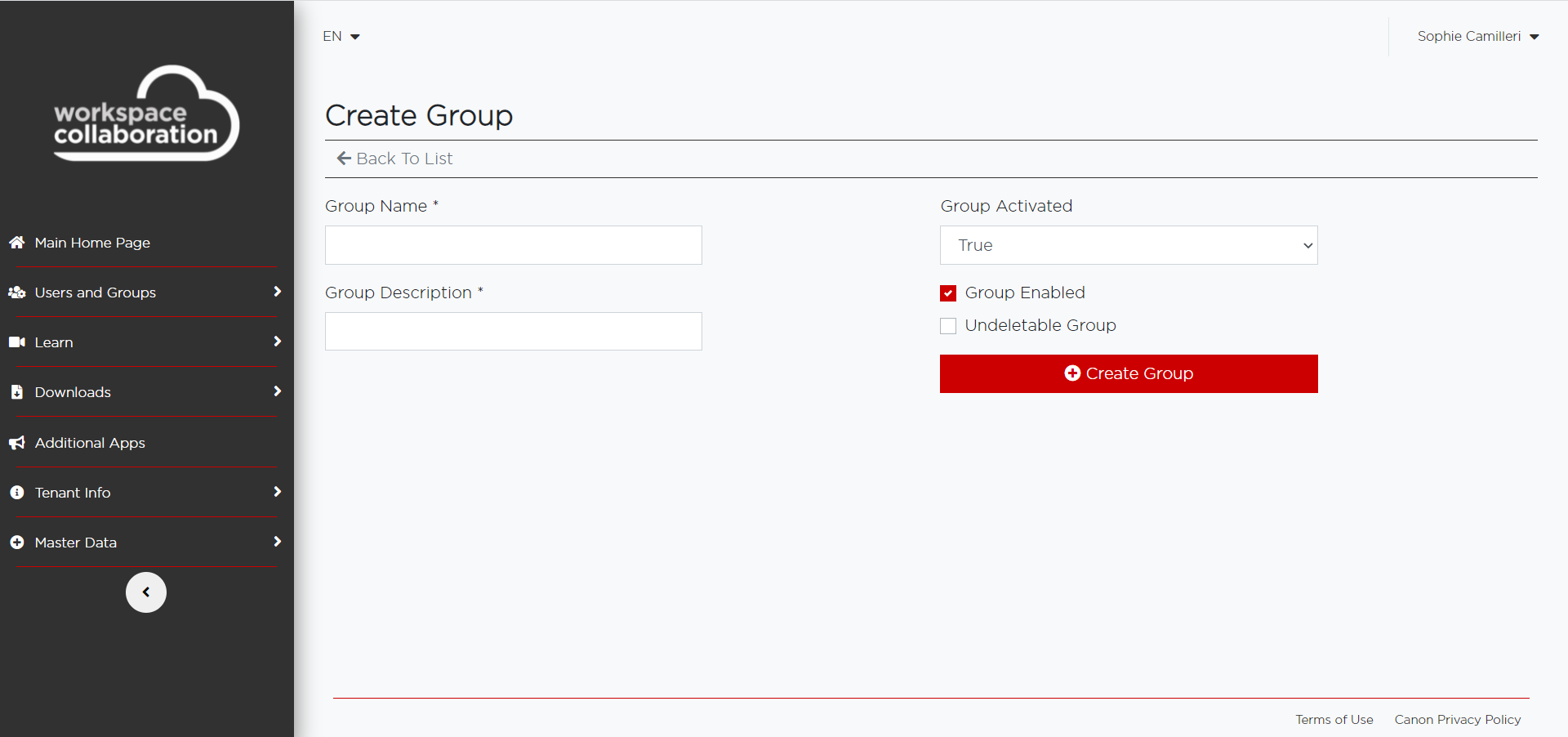 In order to create a group, the administrator must click the Create Group button, and the following page will appear. The administrator then needs to add a group name, group description, and activate the group ('True'). They also have the options of make the group undeletable. Then click Create Group and the new group will be added.