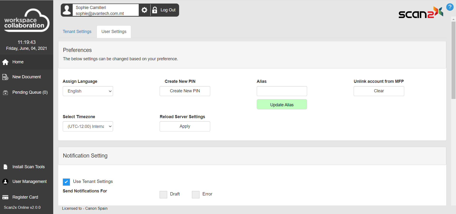 The user also has the option to unlink their account from multifunctional devices if required and can customise the timezone in which they are working.